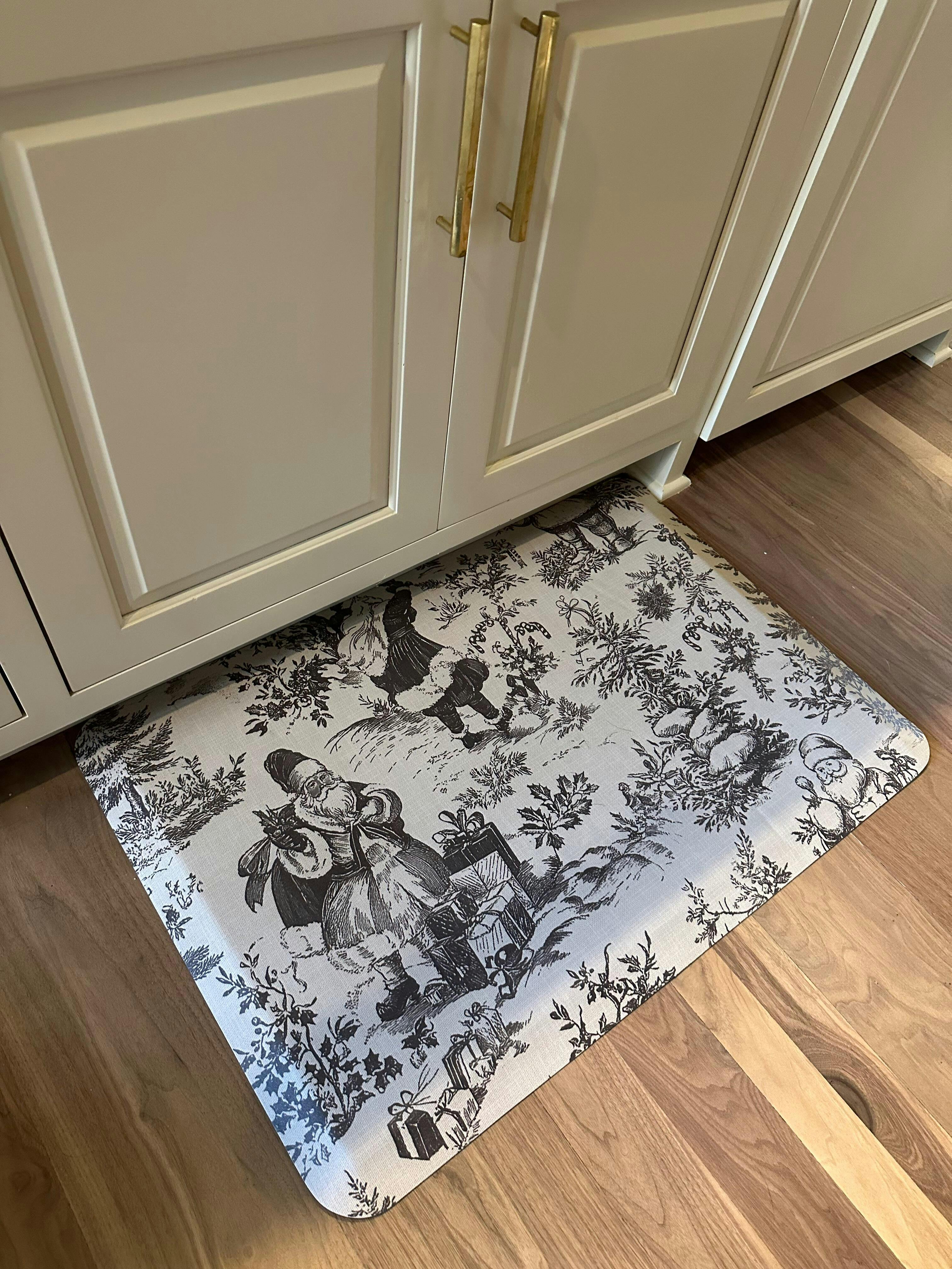 Step into festive comfort with the Happy Feet Santa Toile anti-fatigue kitchen mat. Featuring a charming traditional Santa Toile design in neutral Christmas tones, this mat adds holiday cheer while easing foot fatigue during cooking or baking.
